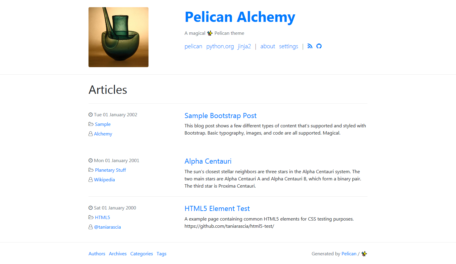 Alchemy is a functional, clean, responsive theme for the Pelican static site generator.